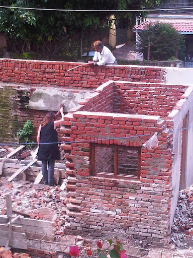Annette and Mr. Dhurga - our engenier from the Kathmandu municipality are checking that the northern wall of our new front house is placed according to the local plans.