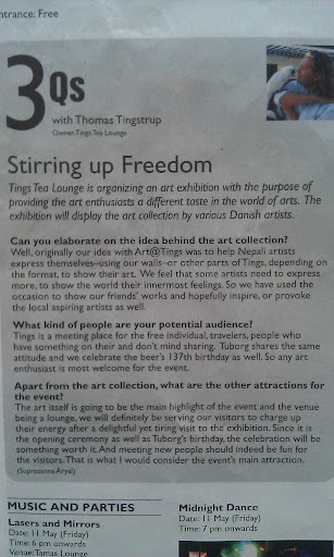 Thomas: Well originally our idea with Art@Tings was to help Nepali artists express themselves – using our walls – or other parts of Tings depending on the format to show their art.The Nepali art we have seen so far is fine. But not more.We have a feeling that Nepali artists are too afraid of expressing themselves, to show the world their innermost feelings. Or rather – to show the wild side of themselves. It’s as if they try to please others, make beautiful things they believe others want, like or… I don’t know. We miss craziness, sex, aggression, blues etc. in most of the art we have seen here. And that is sad – especially because we know that the young talent out there have exactly the same wildness in them as all other artists on this planet.We have been in Kathmandu 3 years now – and we never miss Denmark… we miss our friends and the European Art Scene. Since we have a lot of artist friends ind Denmark, why not use the occasion to get relief from our home sickness by showing our friends works and hopefully inspire – or provoke – the local arts scene to kick our doors down with powerful art.Friday: You said that the pieces are displayed for sale. What kind of art pieces can the interested ones expect?Thomas: Depends – some people will love it. And some people will really hate it. If you are among the first ones you get something that kicks your inner doors down and touches your mind and heart and lower parts of your body very strongly…Friday: What themes does the collection cover?