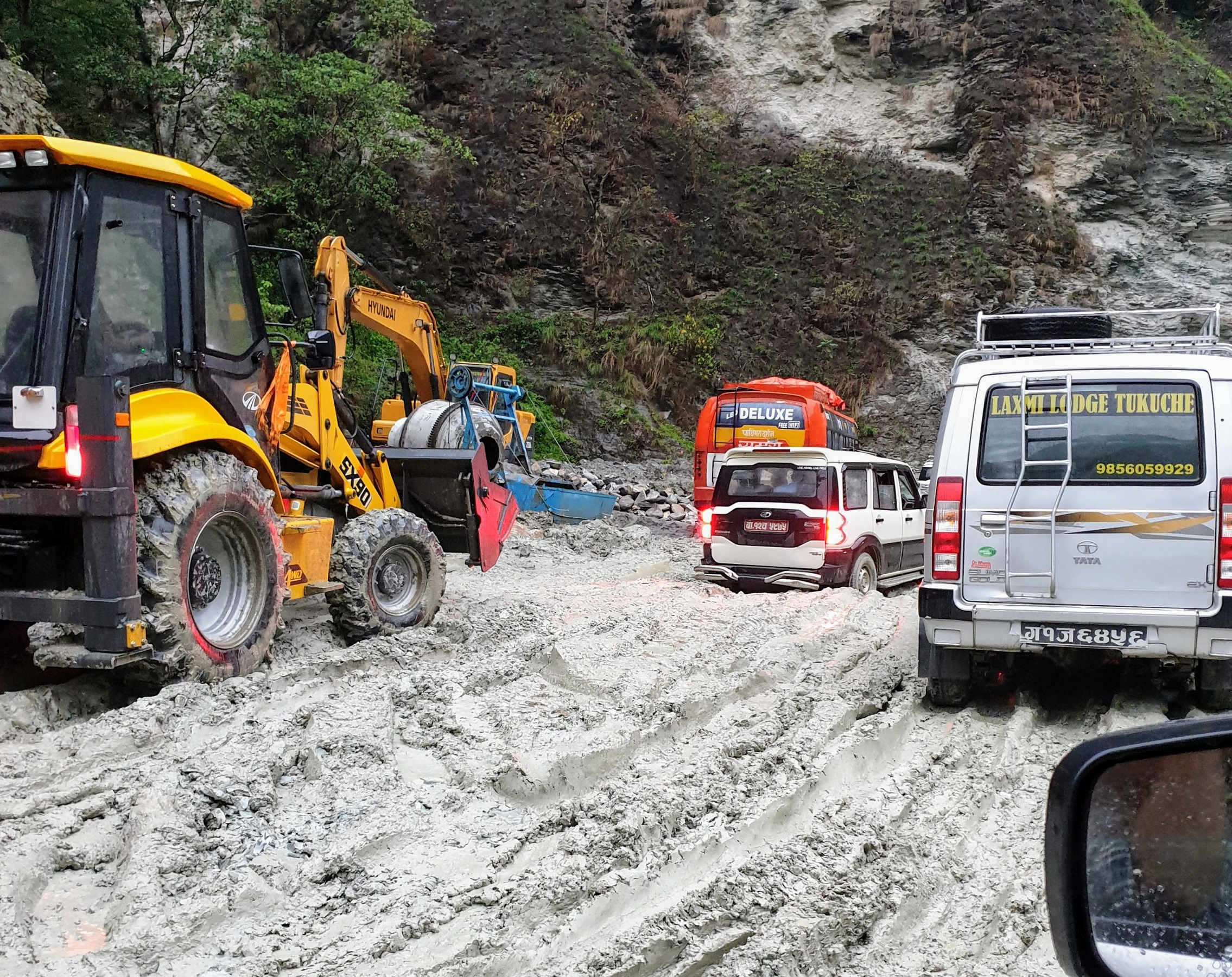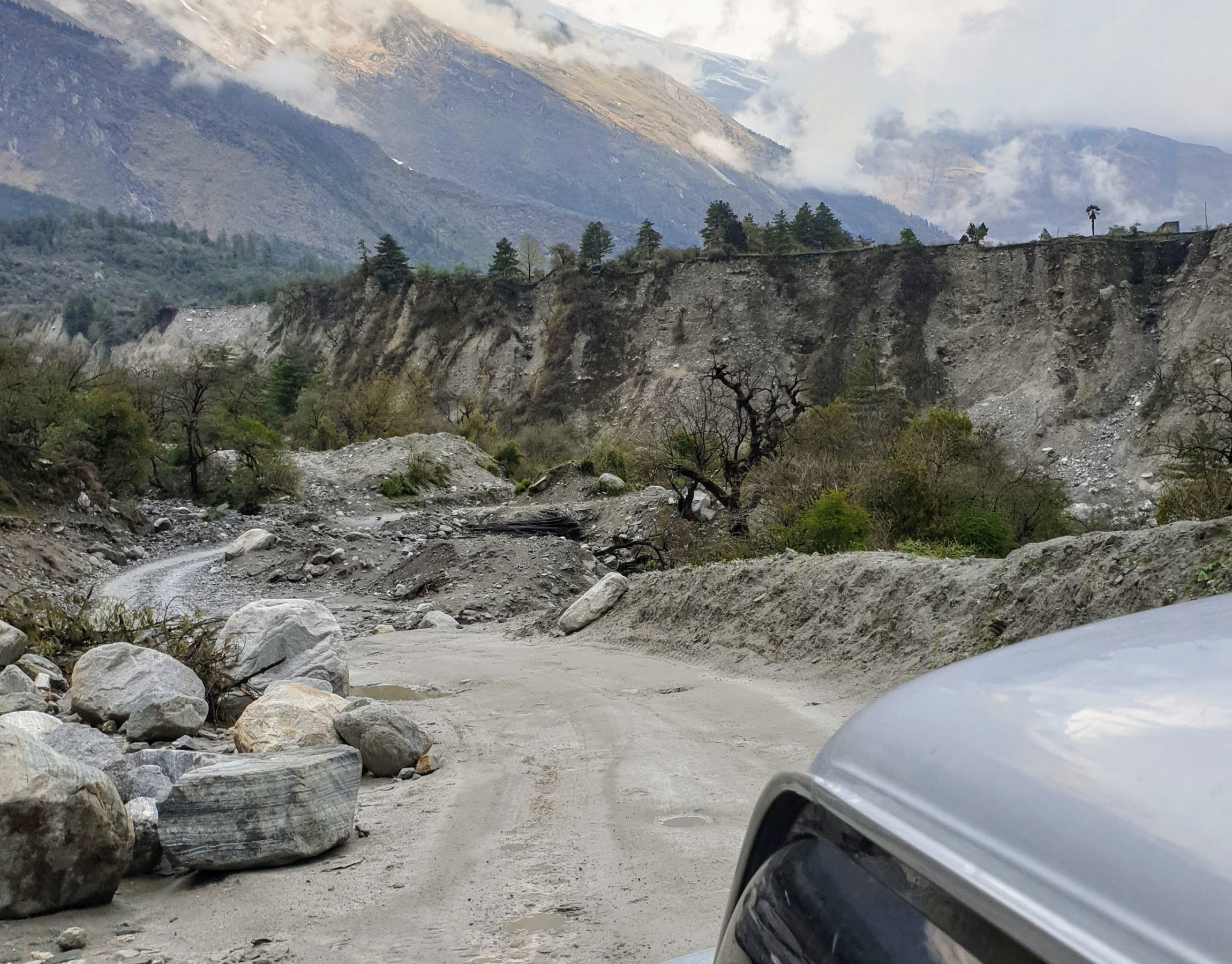 It was quite a surprise to see it’s condition – we had expected a more ‘finished’ road. But because of the rain and weather in general the road was like many other Nepalese roads, but way better than before the construction. Some parts where chaotic with busses and trucks blocking everything because they we’re stucked in the mud at had to get pulled out by huge construction tractors. Parts of the road were a bit scary – especially after dark – but far from some of the roads we have been driving ourselves when we had our own 4WD years ago. Once we actually doubted that we would reach our final destination and prepared ourselves for a night in the Jeep. But finally we managed to get to TatoPani.